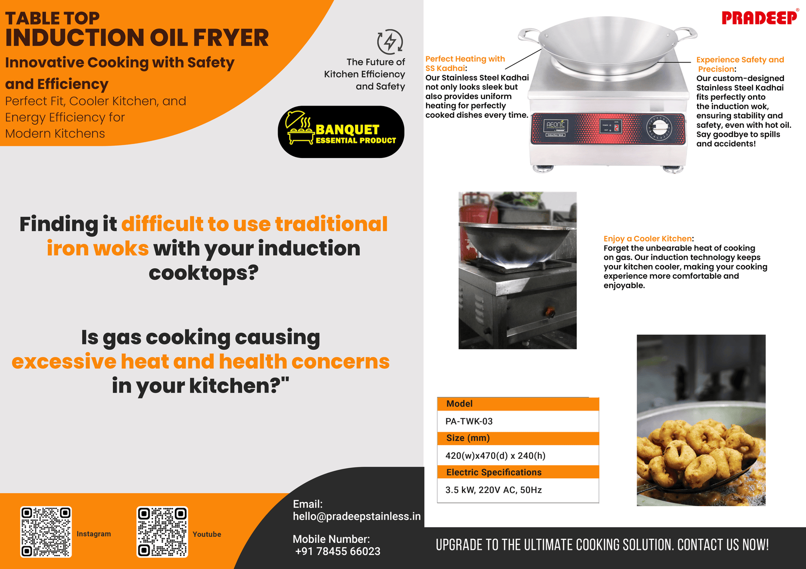 Are you struggling to use traditional iron woks with your induction cooktops? Is gas cooking causing excessive heat and health concerns in your kitchen? Upgrade to the Table Top Induction Oil Fryer, designed for innovative, safe, and efficient cooking. This fryer is a perfect fit for modern kitchens, ensuring a cooler work environment and improved energy efficiency.